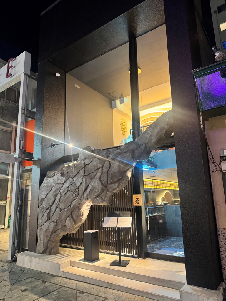大きな岩のオブジェ、吹き抜けを生かしたファサードが特徴的な外観